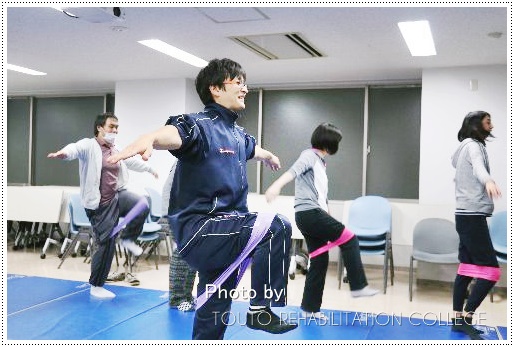 前半はトレーナーの役割と現状やトップアスリートを担当する際のテクニック、体幹理論などをトレーニング現場の映像を交えながらお話しいただき、後半は実技を中心に効果的なストレッチ方法、体幹バランストレーニング、チューブトレーニングを体験。今回ご指導いただいたのは医学的観点から考えられたトレーニングであるため、リハビリや転倒予防等につながる内容となっていました。講義全体を通して、ストレングス面だけでなく、メディカル面での説明も取り入れていただき、非常に参考になりました。学生たちにとっては心身共に良い刺激になったことでしょう。