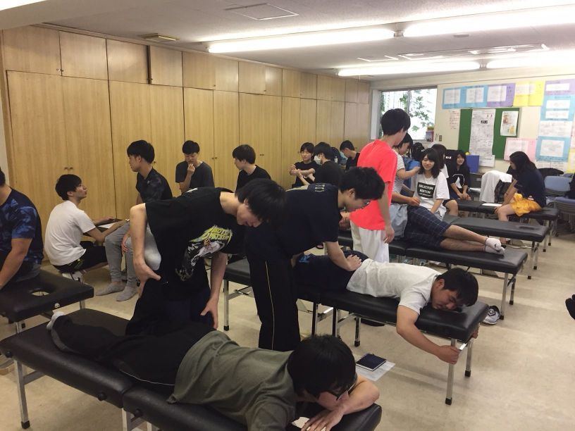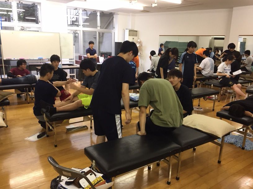 右も左も、理学療法についてもまだ分からない1年生に、実習を終えた4年生が丁寧に実技を教えてくれています。