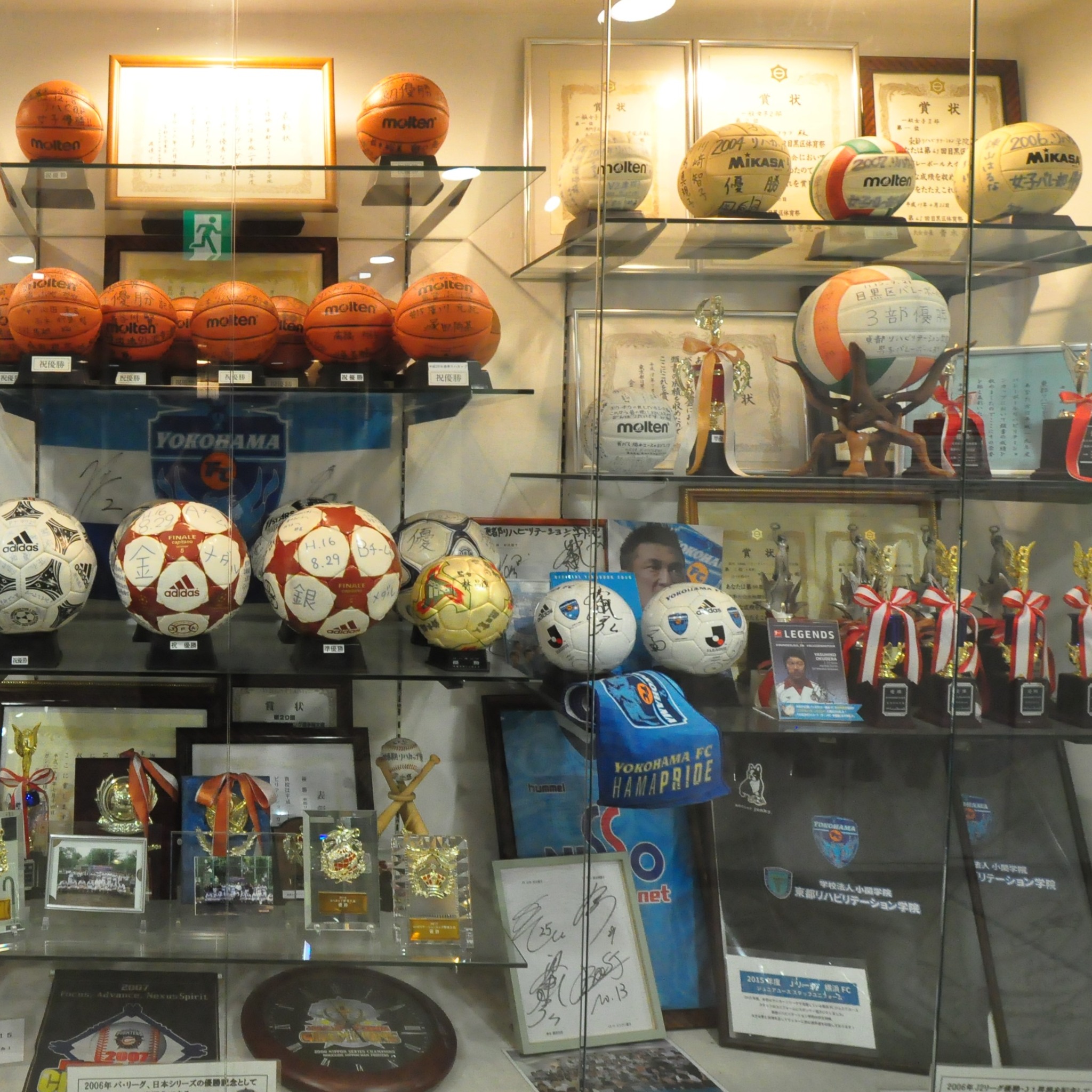 新校舎1階には、各クラブ活動の輝かしい成績のトロフィーが飾られています。