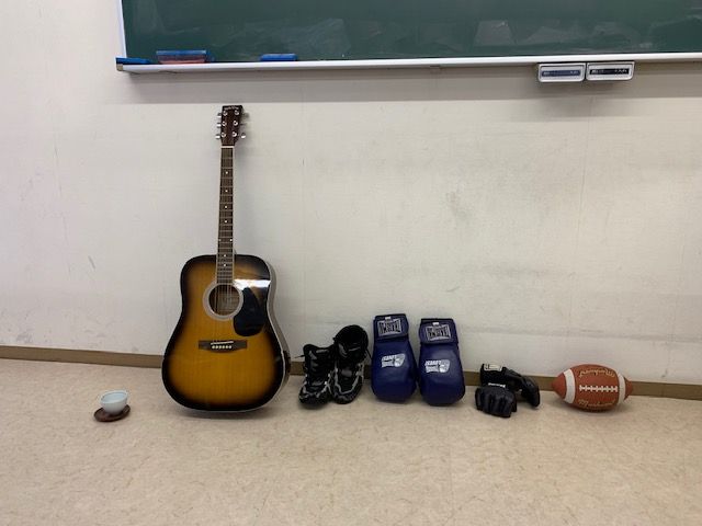 これは左から湯飲み、ギター、レスリングシューズ、ボクシンググローブ、総合格闘技用のグローブ、アメリカンフットボールのボールです。