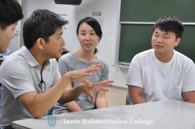私の授業はパワーポイントを使わず、ほとんど黒板を使って授業を展開しています。授業は1回限り、その時間は教員と学生で築き上げるもの、その瞬間の声や雰囲気を感じながら授業を進行するように心がけています。これはリハビリテーションも同じ、相手が何を望んでいるのかを考えながら興味を抱くように指導することを努めています。また、私は理学療法士の資格を取得する前に、約6年間のサラリーマンを経験しました。医療分野以外の社会現場で経験してきたこともふくめて、幅広く学んでもらいたいです!