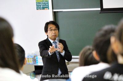 今回、公益社団法人 東京都理学療法士協会 森島健会長をお招きし、「理学療法士の魅力と将来について」をご講演いただきました。冒頭にて森島会長から参加者の皆さまに「既に理学療法士になろうと志を持つ方はより一層理学療法士の魅力を感じていただきたい。まだ理学療法士になろうか悩んでいる方は、他職業も同様にとても素晴らしい職業です。その中で理学療法士への理解を更に深め、その上で検討いただきたい。」と述べられました。「理学療法士は今後ますます社会のニーズが高まる職業の1つです。これまで理学療法士は病院などの医療機関においてリハビリテーション科で従事してきました。今後は障害をもつ前段階である介護予防や健康増進などの観点においても、理学療法士の技術が求められています。更に2020東京オリンピック・パラリンピックにおいて、選手村・ポリクリニックで活動する医療スタッフは、世界基準として医師、看護師、理学療法士等が中心となって運営しています。また理学療法士は職業のみならず、研究や教育の分野においても学術研究大会等を定期開催するなどの活動をしております。2023年には、WCPT(世界理学療法士連盟)の総会と学会が東京で開催されます。様々な環境に配慮して、誰もがより良い生活を送れるように配慮することが理学療法士の使命でもあります。」とご説明いただきました。