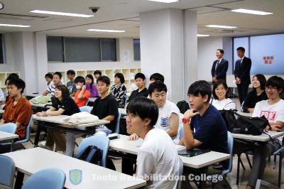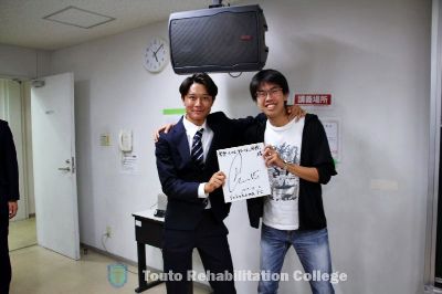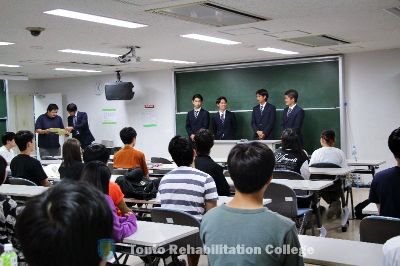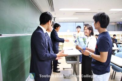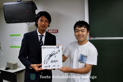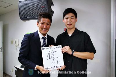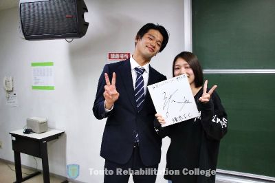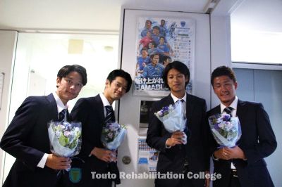 選手達からご挨拶を頂き、その後は学生達からの質問コーナーの機会をいただきました。理学療法士を目指す学生ならではの質問が飛び交い、選手達からの回答にとても多くの学びがありました。更に、選手達から特別にサイン色紙をかけたジャンケン大会を開催、とても盛り上がりました!!学校から感謝の意を込めて、花束を贈呈させていただきました。横浜FCの皆さま、お忙しい中、ご来校いただきまして誠にありがとうございました!これからも応援しておりますのでご活躍をお祈り申し上げます。