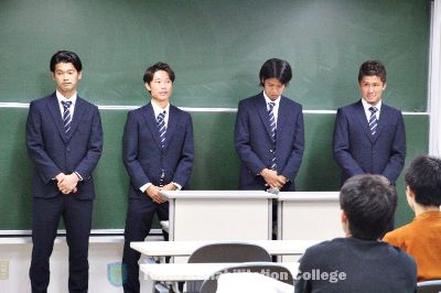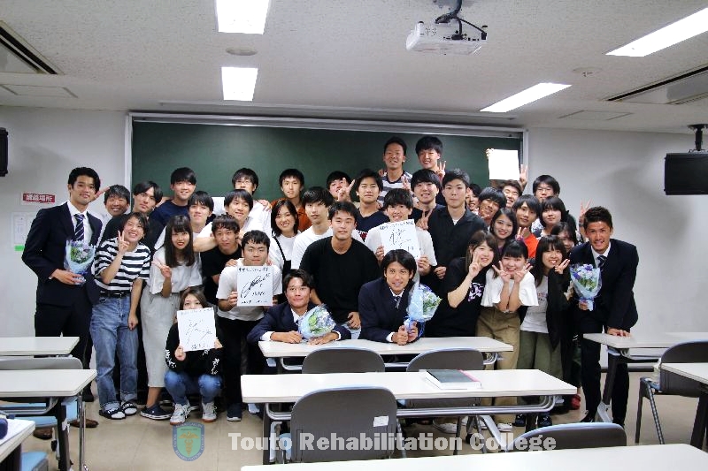 まだまだシーズン中、そして順位(J1昇格)を決める非常に大切な時期に貴重なお時間をいただきました。男子学生も女子学生も一同「格好良い!!!!」と大絶賛、いつものユニフォーム姿も格好良いですがスーツ姿もとても格好良かったです。