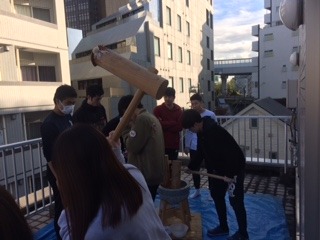 餅をつく学生と合いの手の学生が息を合わせながら行う共同作業は、入学してから8か月が経った中で培ってきたクラスの絆を感じさせますね。