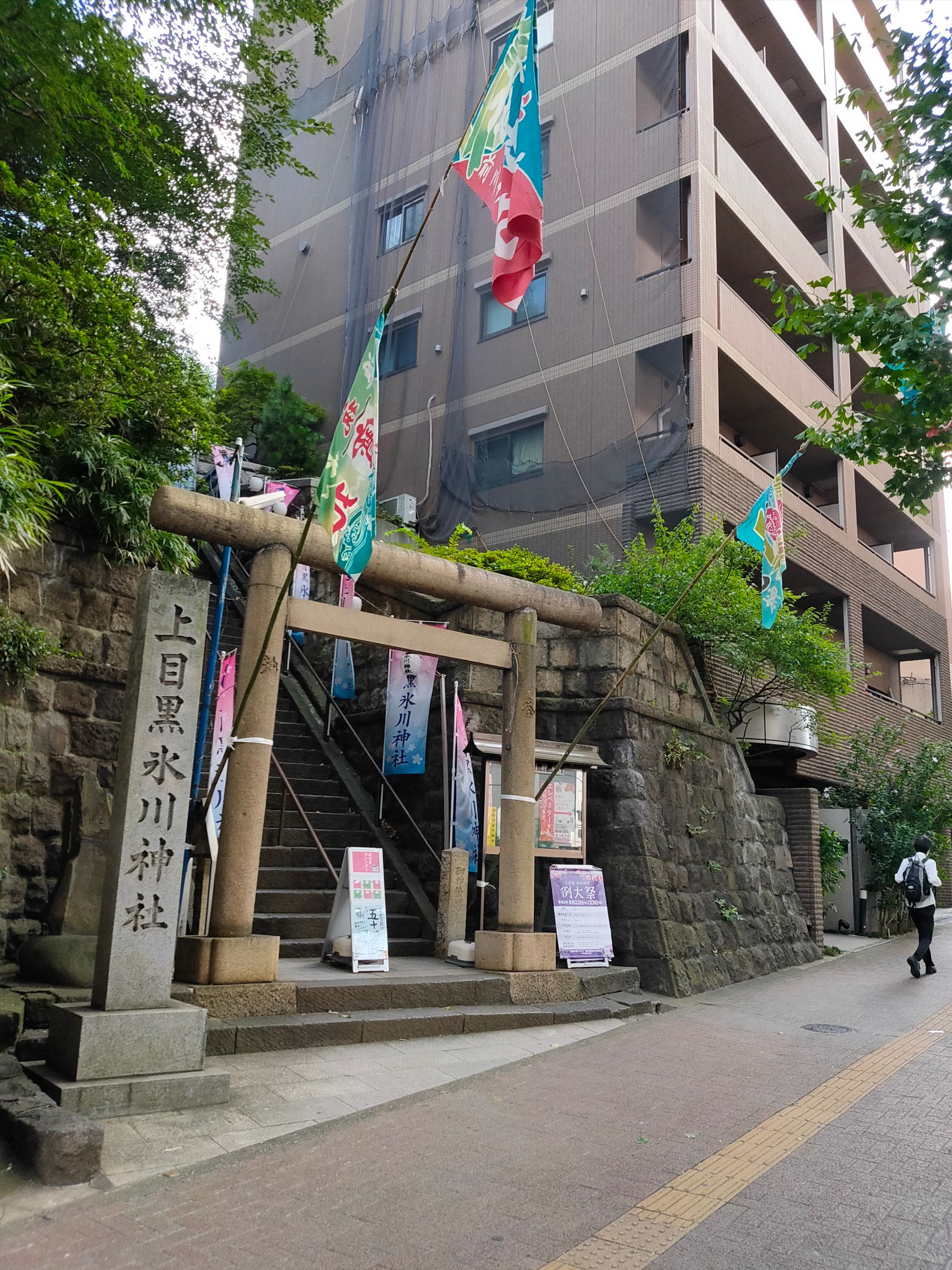 以前紹介した本学院南校舎隣の上目黒氷川神社の鳥居に大漁旗のような幟(のぼり?)が見られました。