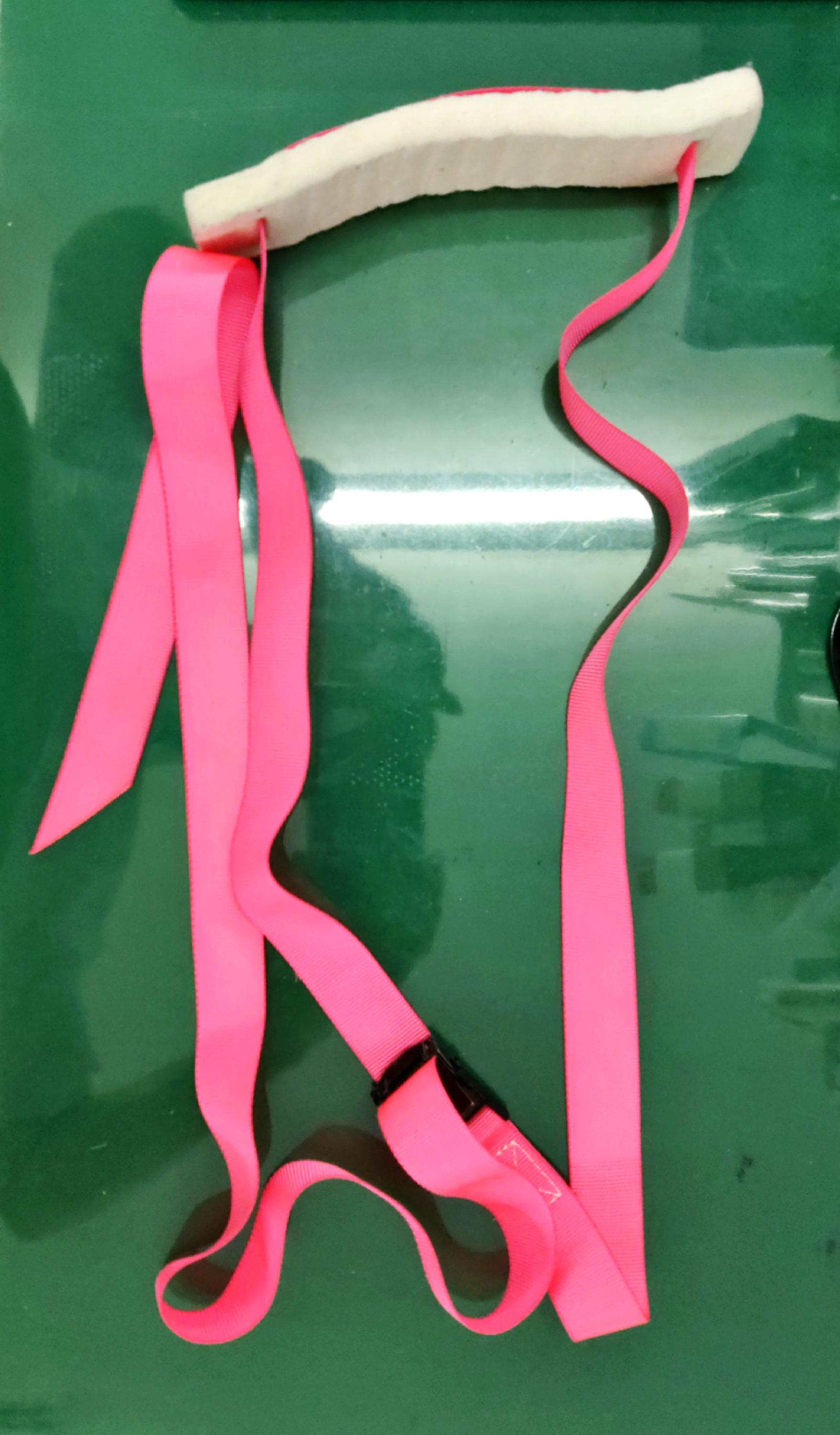写真1は百均ストアーで購入した荷造りロープにフェルトを付けた物です。私は勝手に「第3の手」と呼んでいます。主にストレッチングの際に骨の操作や固定に使っています。