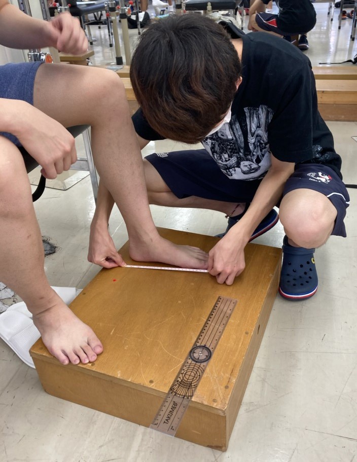 ということで本日の授業では、足部の内側アーチの程度について検査を行いました。