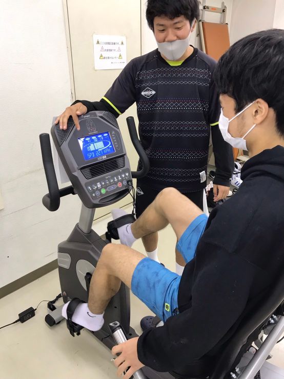 ペダルの重さや漕ぐ速さを設定することで負荷量を設定できるリハビリ機器ですが、20歳前半の学生さんたちは少し強めの負荷でも頑張って運動していました!