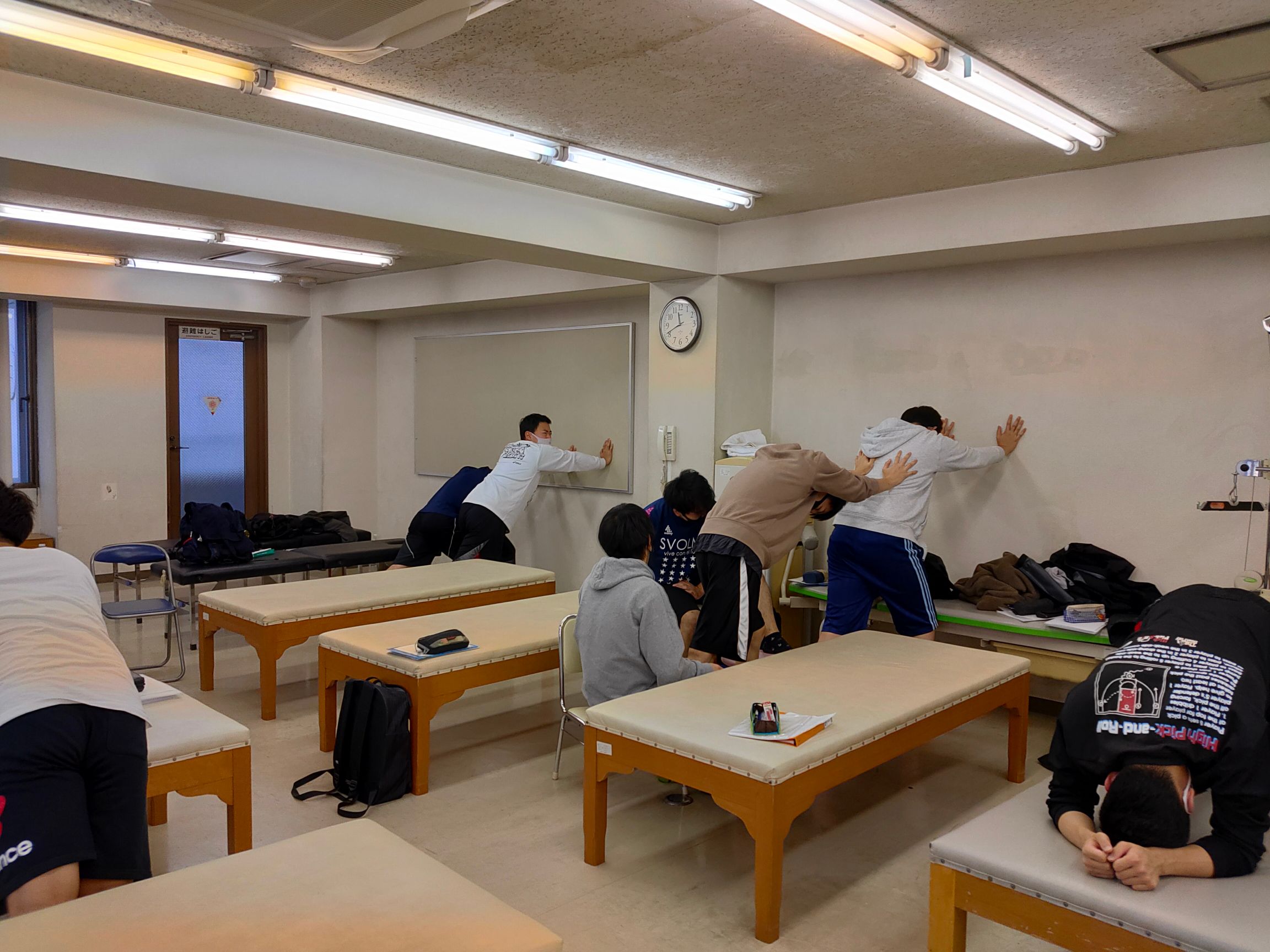 今回の受業では「スタティックストレッチング」という勢いはつけずにゆっくりと目的とする筋を引き延ばし、その肢位を維持する方法を学んでもらいました。