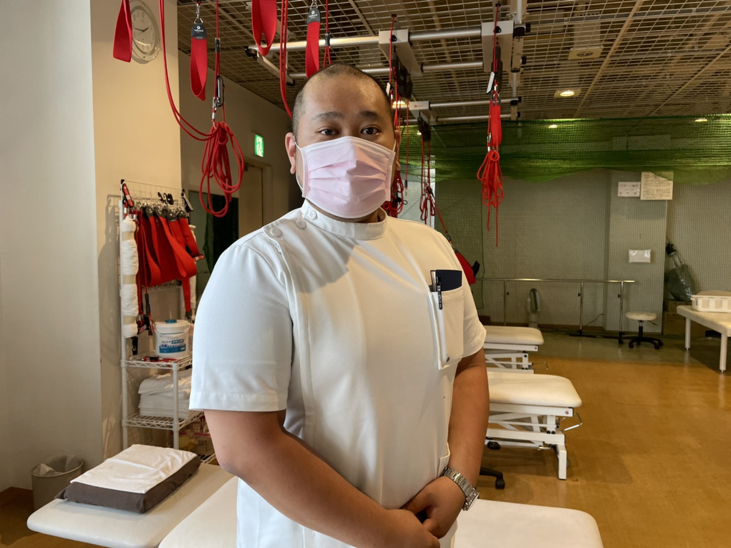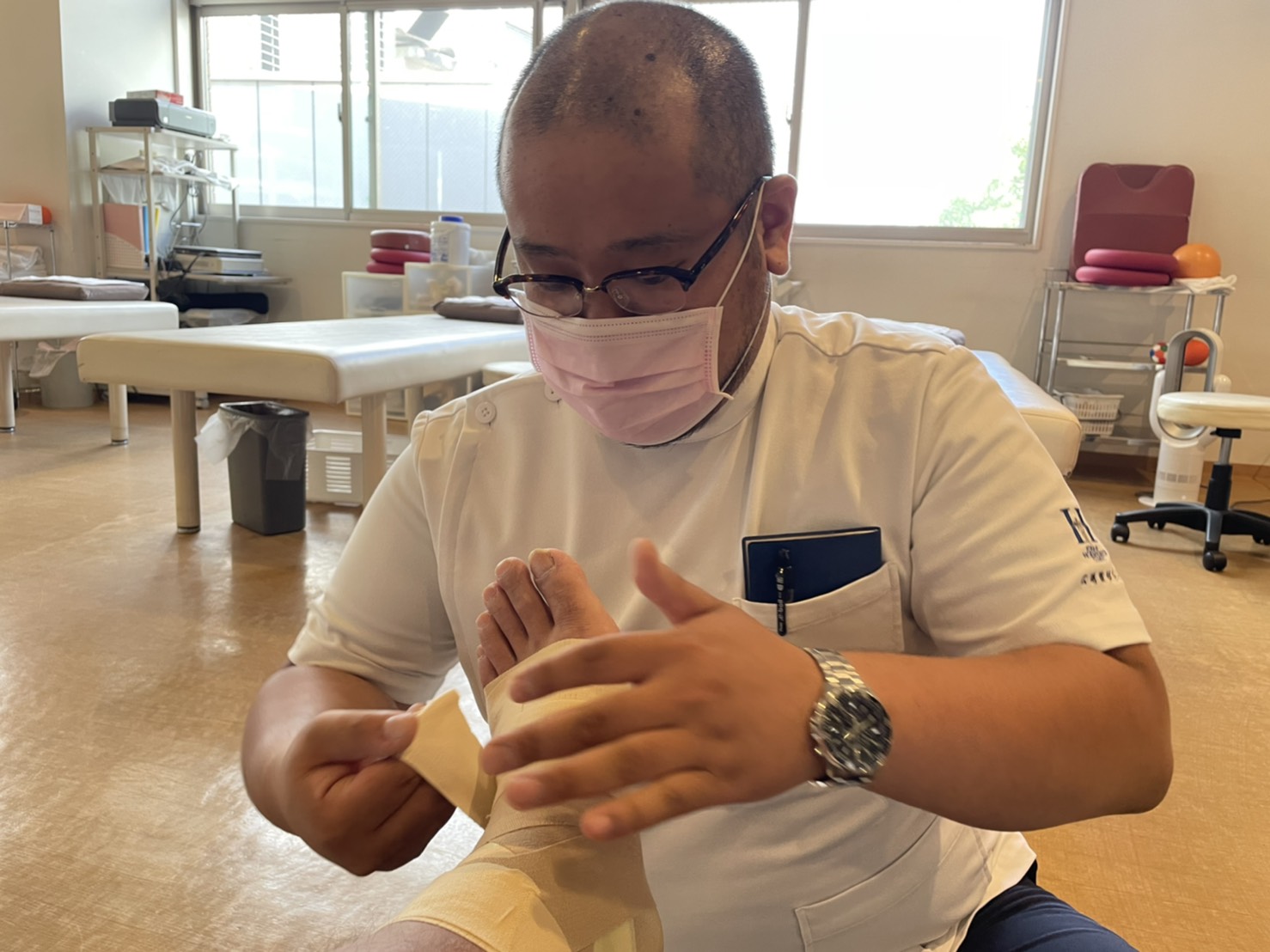 リハビリは、理学療法士 鴨下亮太先生(本校卒業生)が担当していただいています。正直、発症直後は本当に不安でしたが、鴨下先生のリハビリを受けるごとに、みるみる回復していく足に感激します。毎回、動きを診ていただきながらテーピングも工夫していただいているため、本当に楽に歩けることに驚きます。