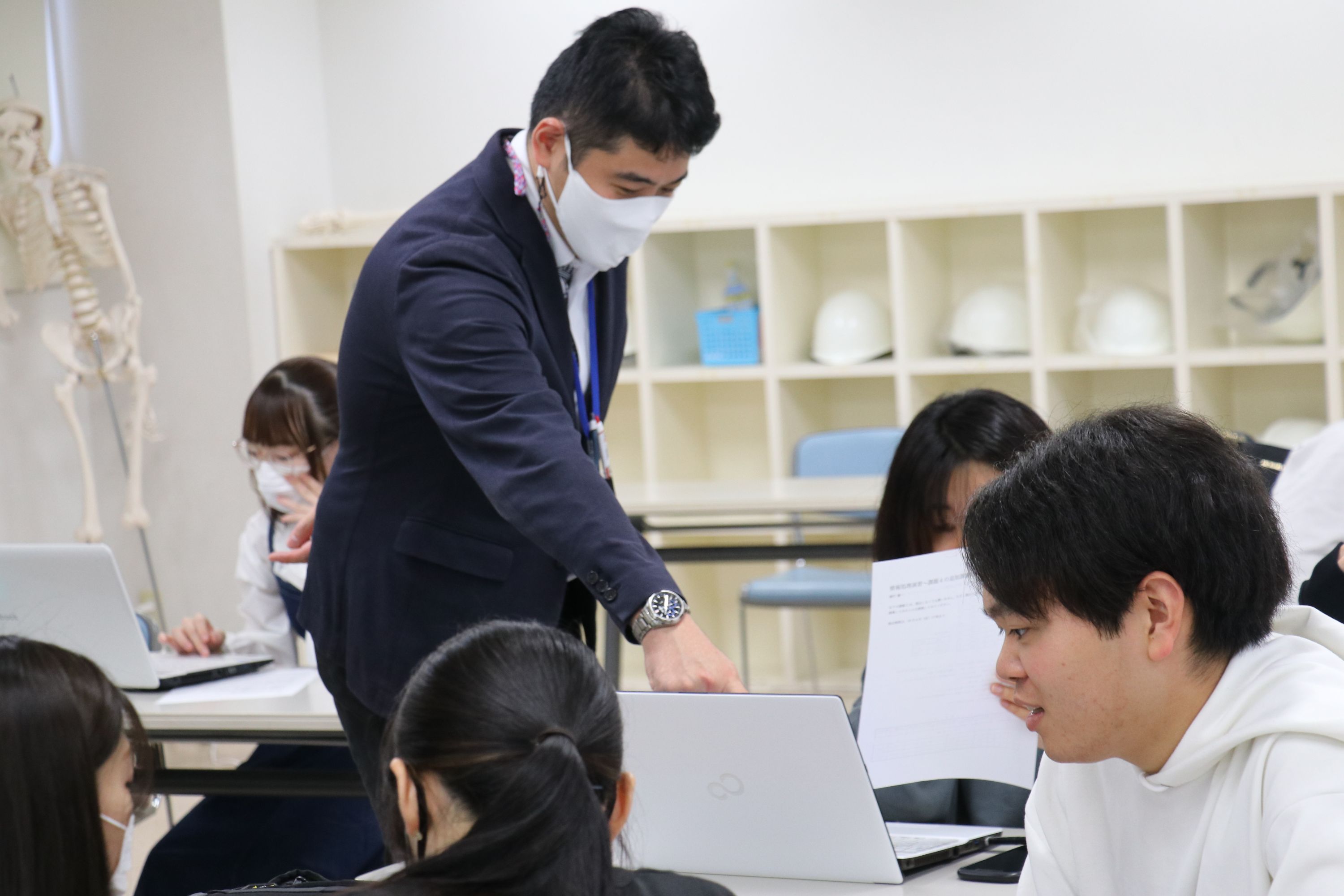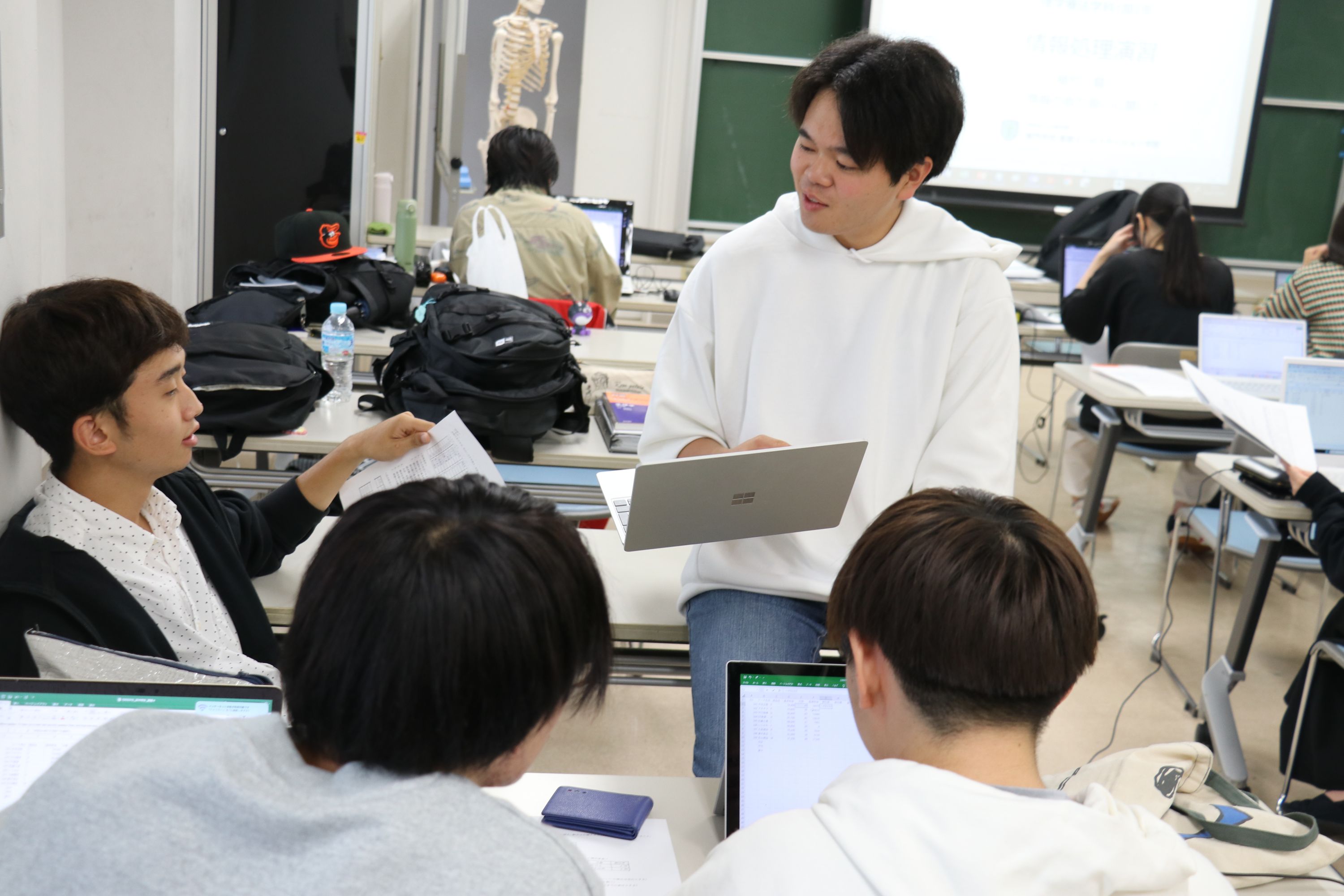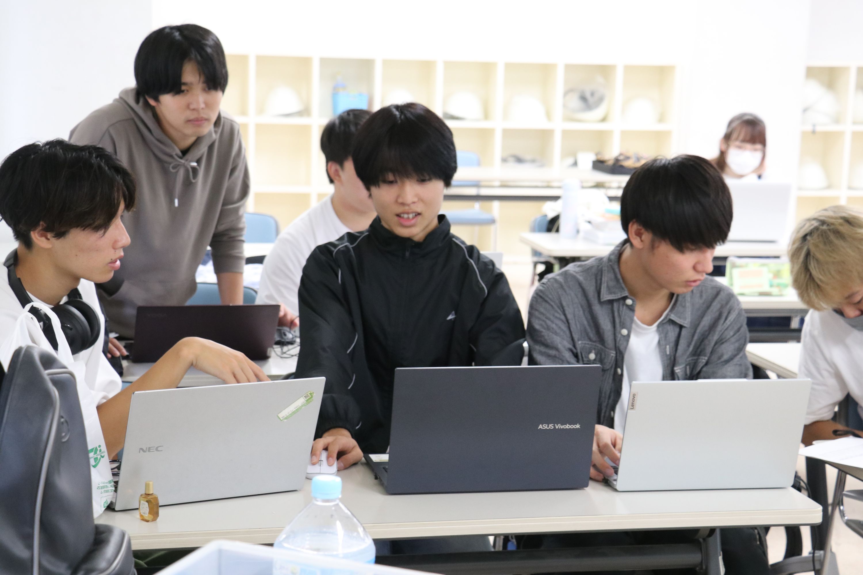 この授業に関しては、パソコン使用能力によって差が出ますが、苦手な人が得意な人の近くで教わりながら課題の作成に取り組んでいます。