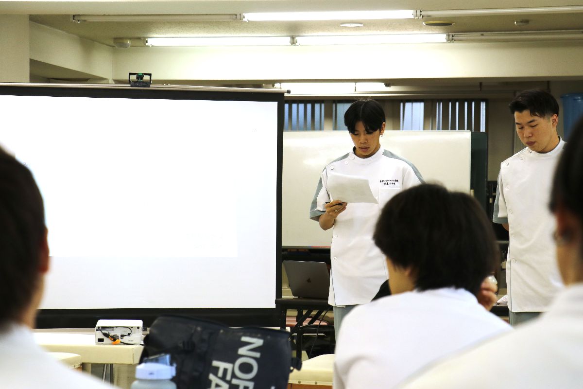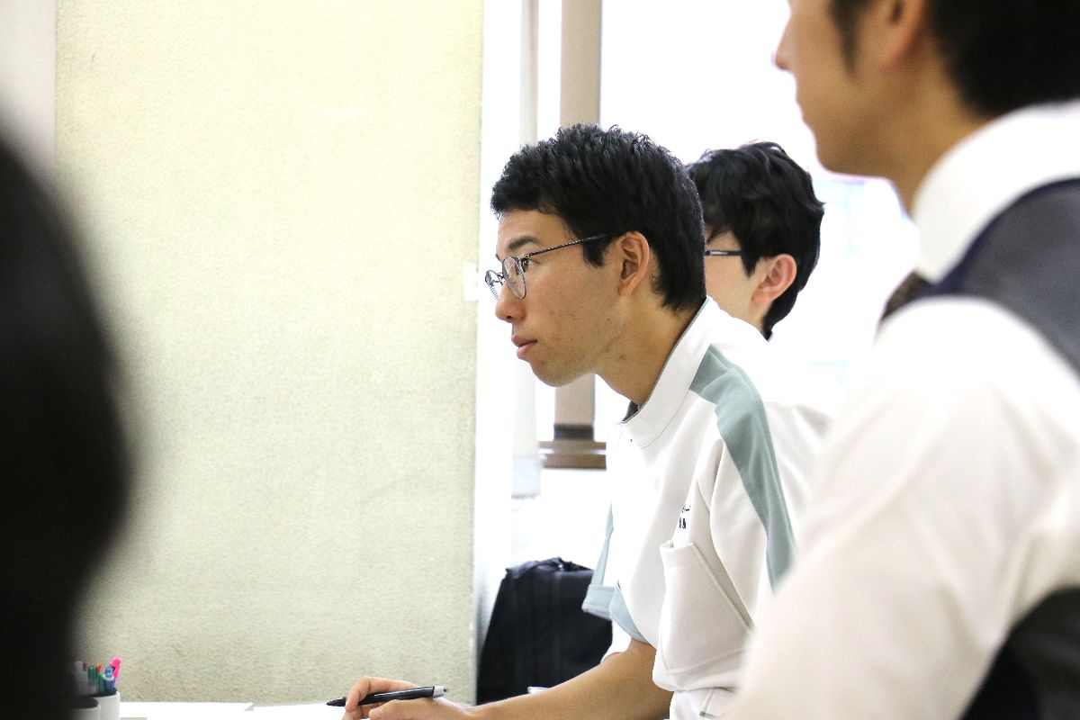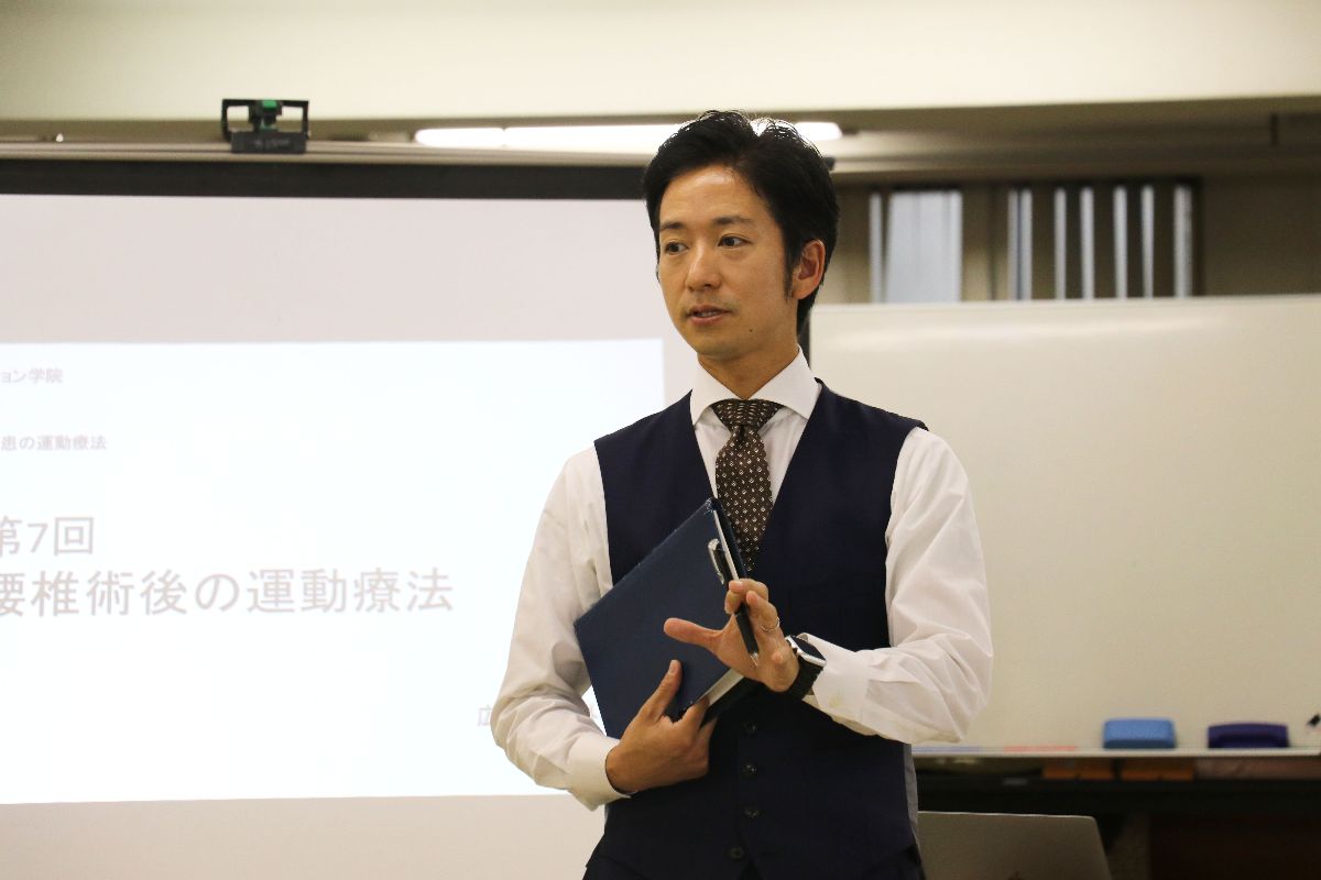 今回ご紹介する授業内容は「腰椎術後の運動療法」をテーマに、学生たちをグループに分け、自分たちで腰痛患者の状況などを想定した上で評価や改善などを考察して発表する内容でした。学生たちの素晴らしい発表と、その発表に対して石谷先生によるアドバイスのやりとりをすることで、さらに臨床現場をイメージできる雰囲気を醸し出していることが印象的でした。