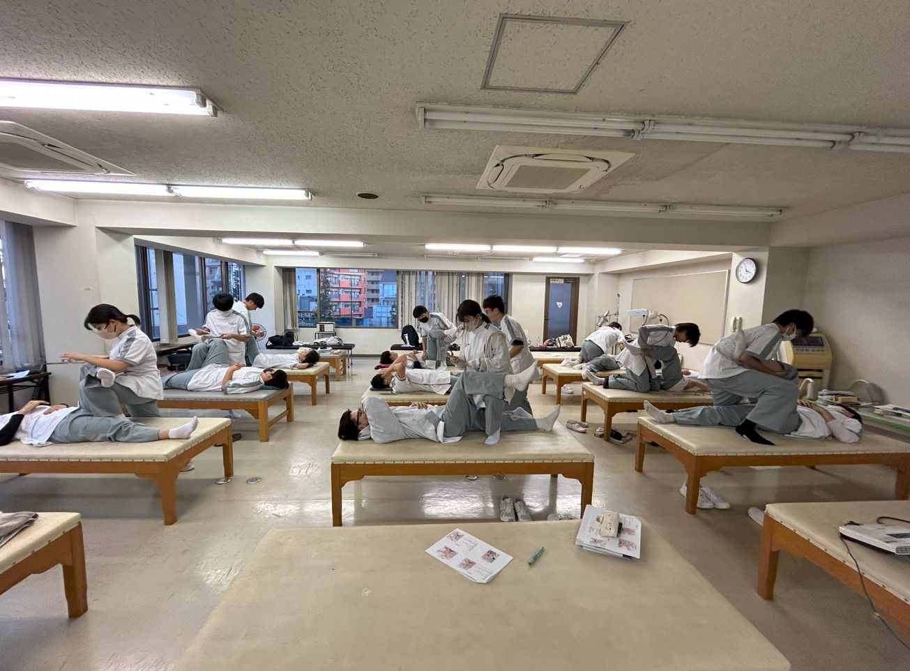 1年生の初めての実技科目である検査測定学Ⅰでは関節可動域測定の実技練習を中心に行っています。
