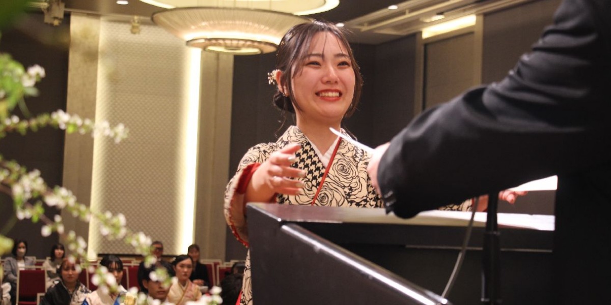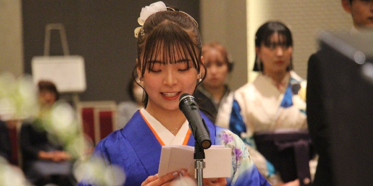 卒業生代表の答辞。学生生活の思い出や社会への決意など素晴らしい内容でした。