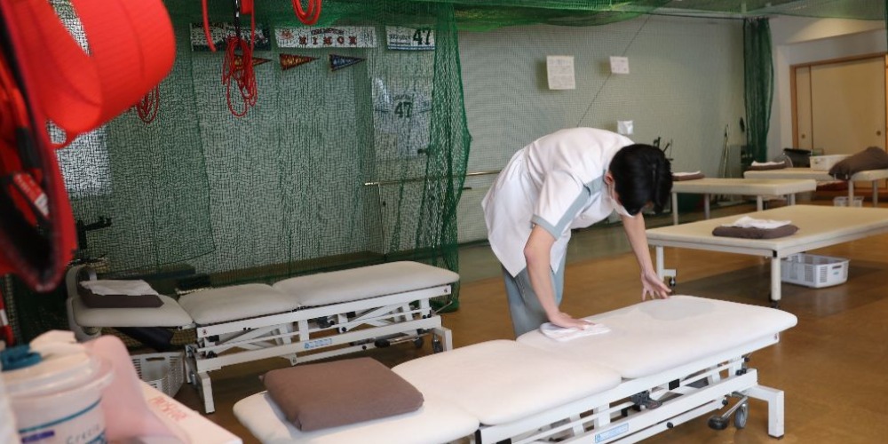 ▲理学療法士のスタッフと一緒に、清掃・消毒に取り組む学生。